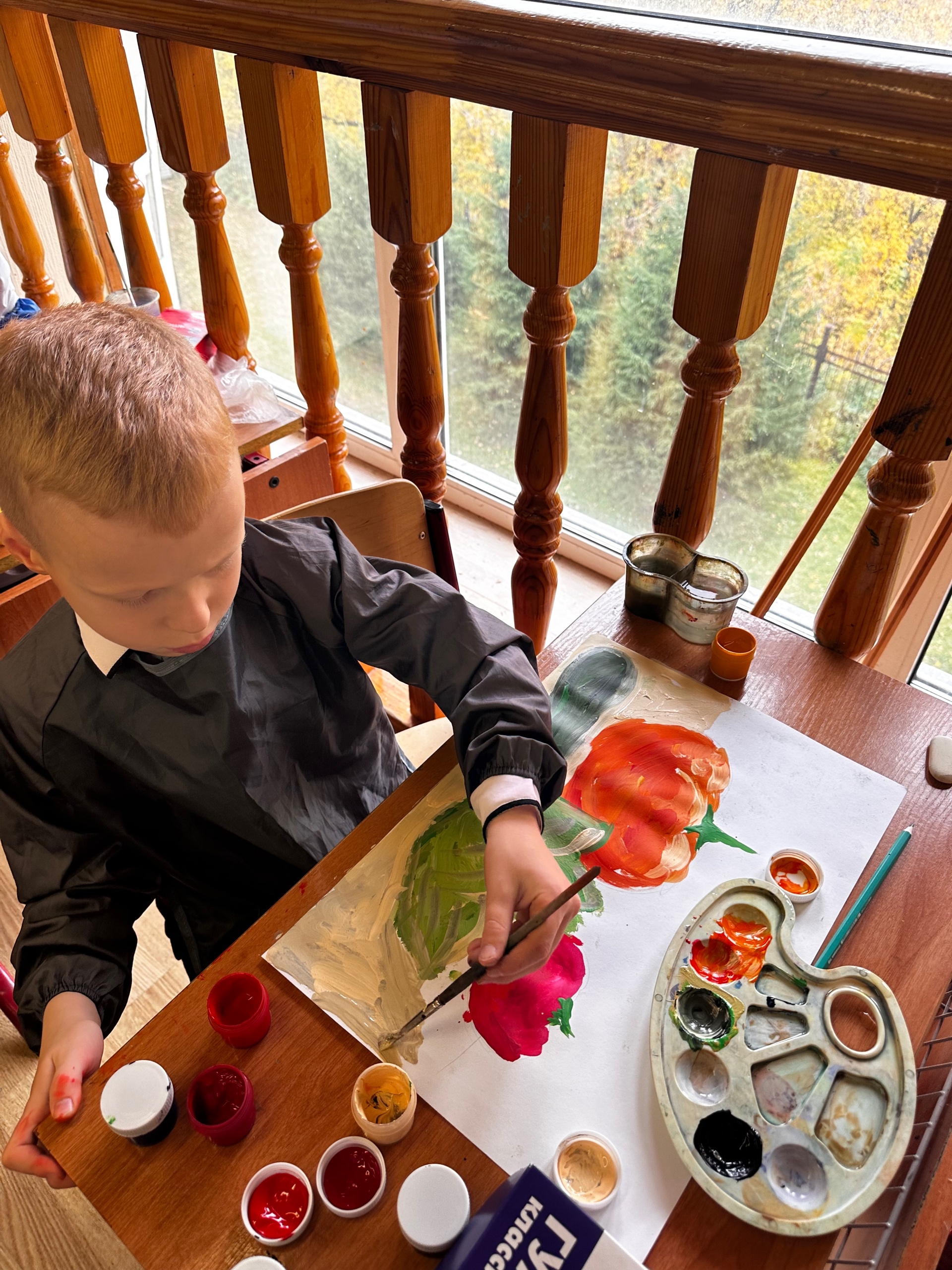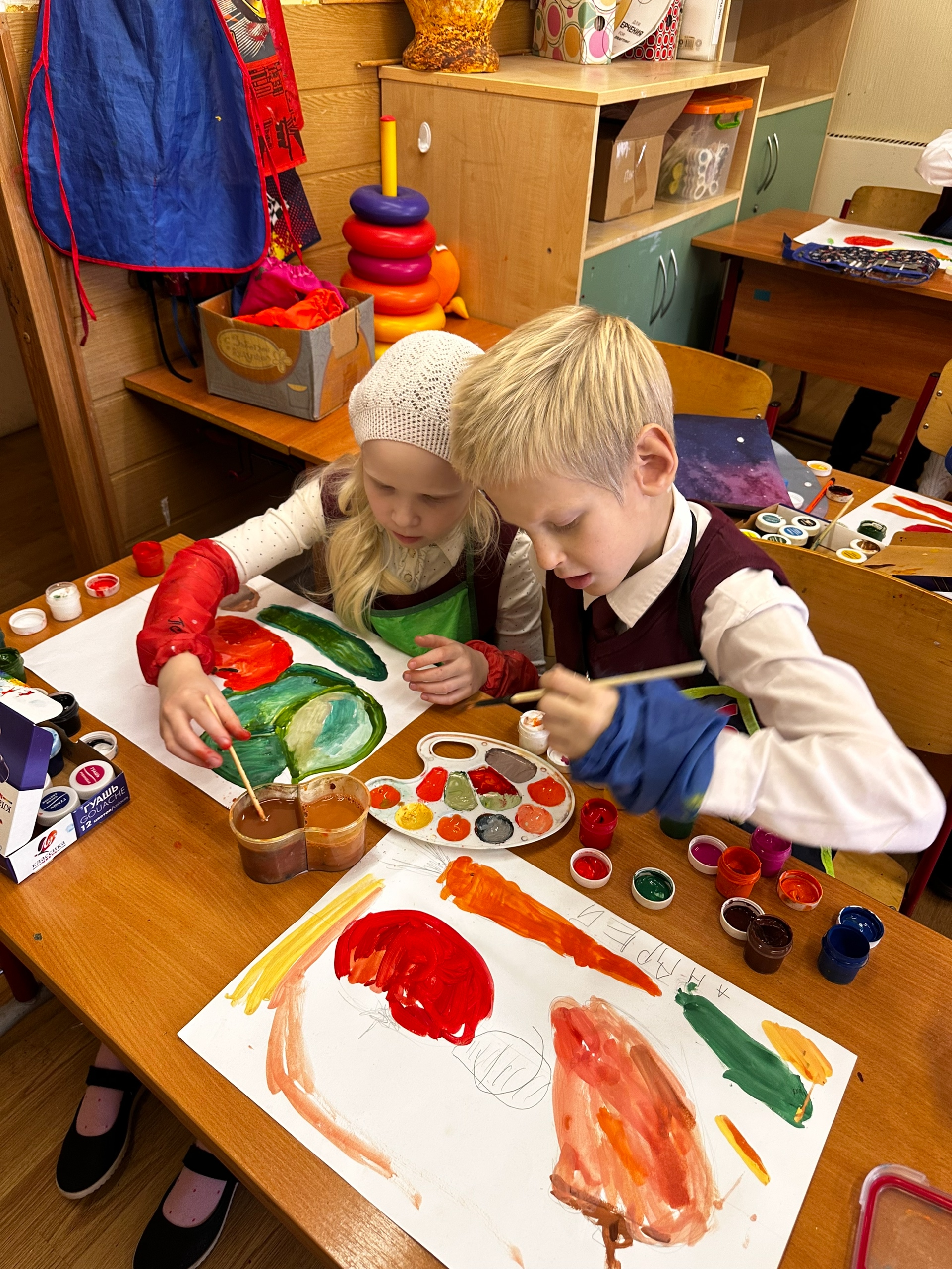 Первый класс на уроках ИЗО начал изучать осенние овощи. Параллельно с изучением их формы и размеров относительно друг друга, мы поговорили о цвете, правилах смешивания красок и работы с палитрой.